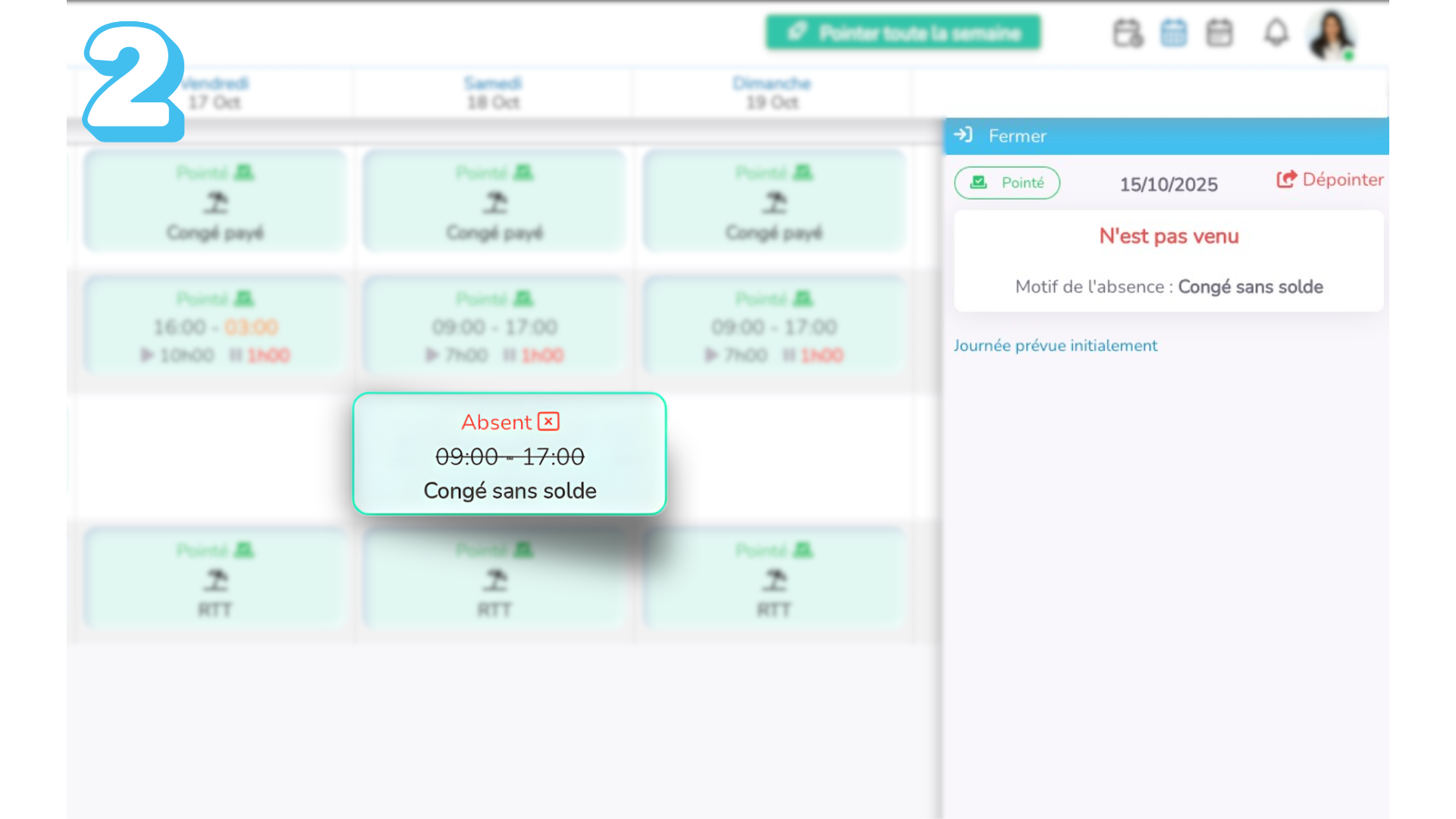 Un collaborateur est arrivé plus tard ? A pris une pause plus longue ? Ajustez ses horaires directement depuis un panneau latéral.