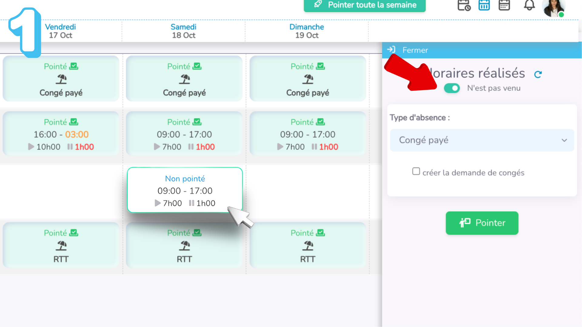 L’action principale ? Le ‘pointage’. En un clic, le manager valide une journée, une semaine ou toute une équipe.
